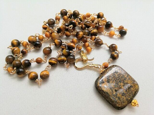 サイズ:40cm(輪)、TOPの石サイズは約3.5cm 材質:タイガーアイ ブロンザイト 真鍮金メッキ K14gf