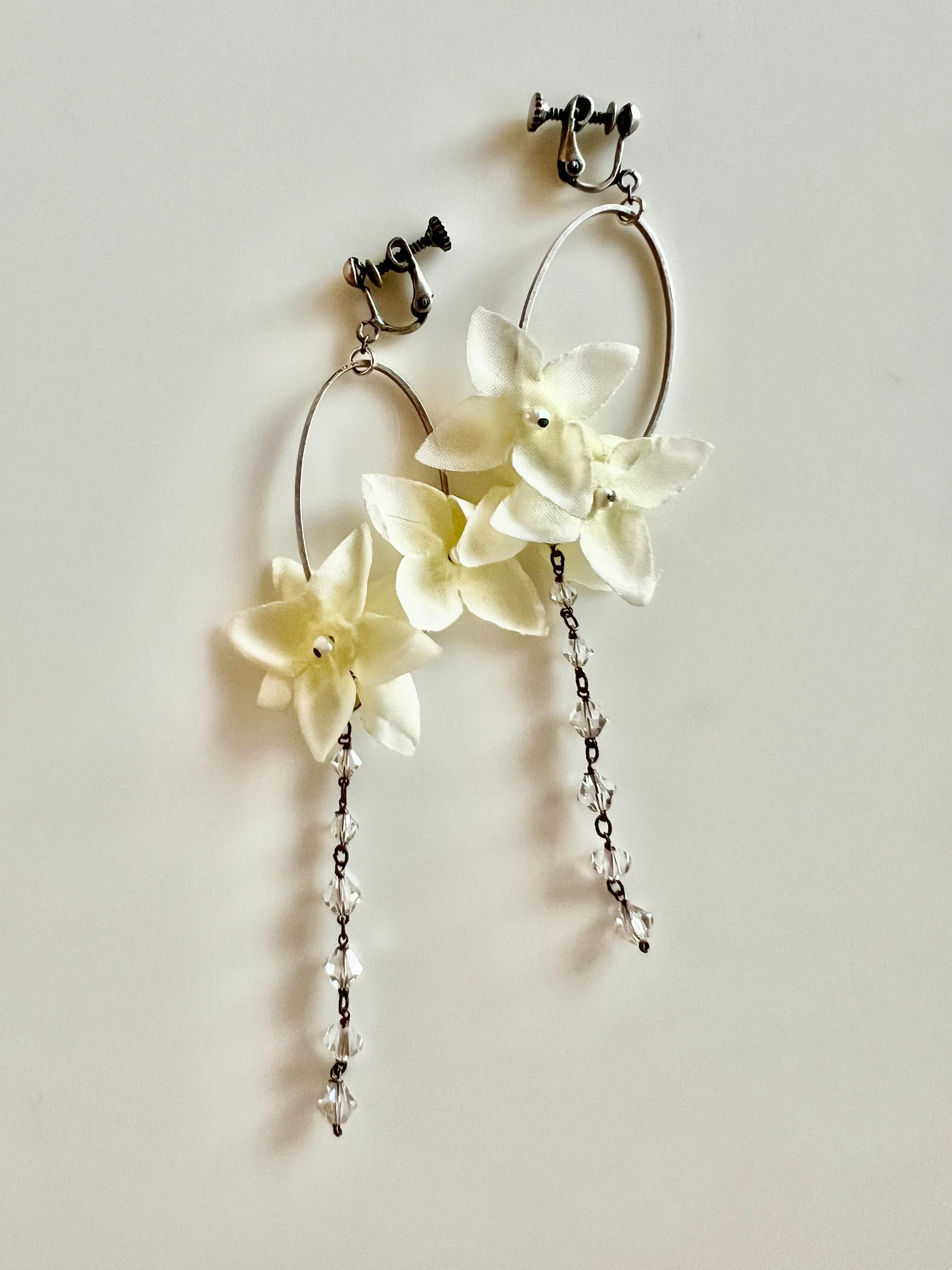 アイボリーの花とクリスタルガラスのロングイヤリング | daphnemeria(ダフネメリア)