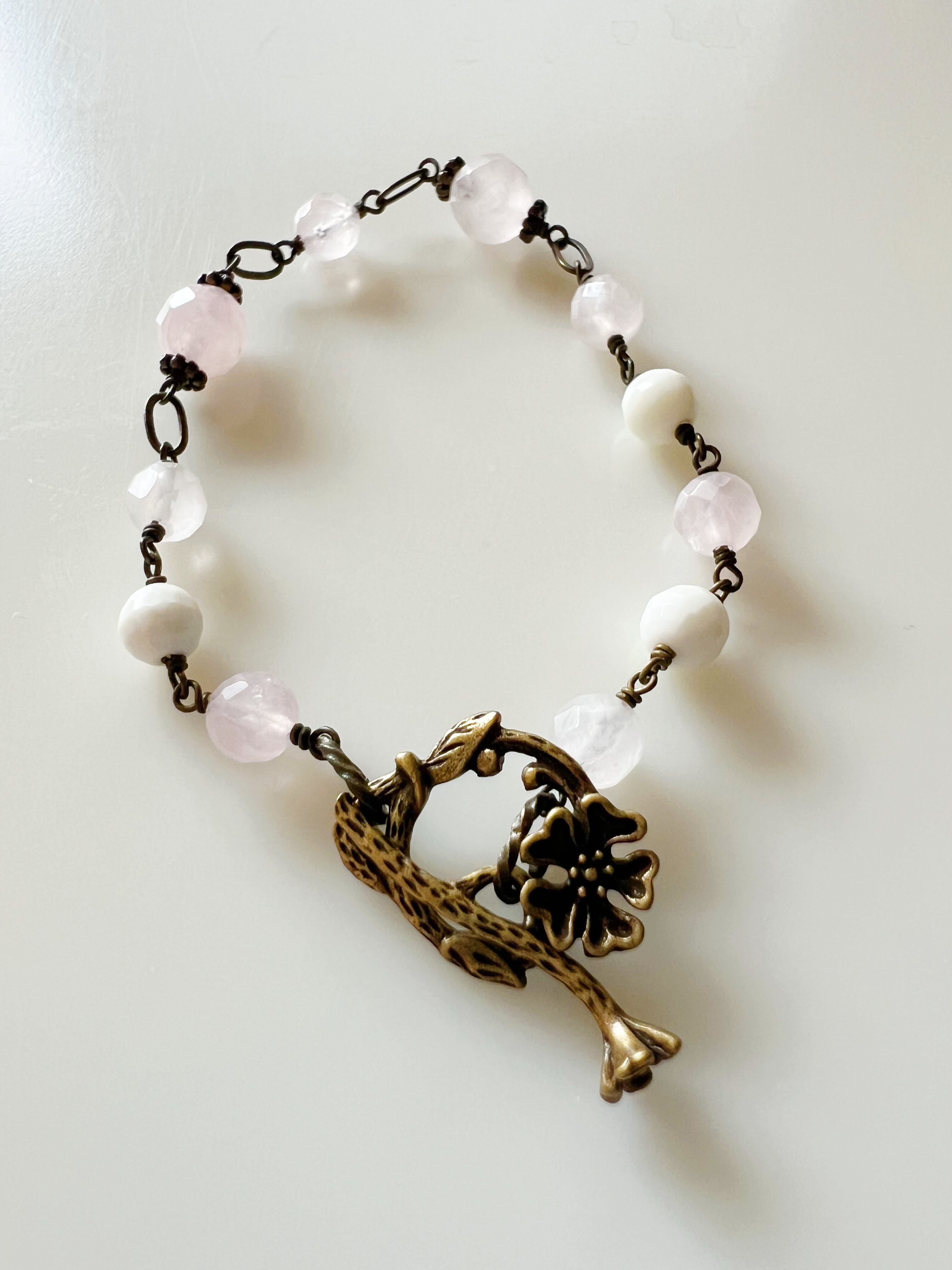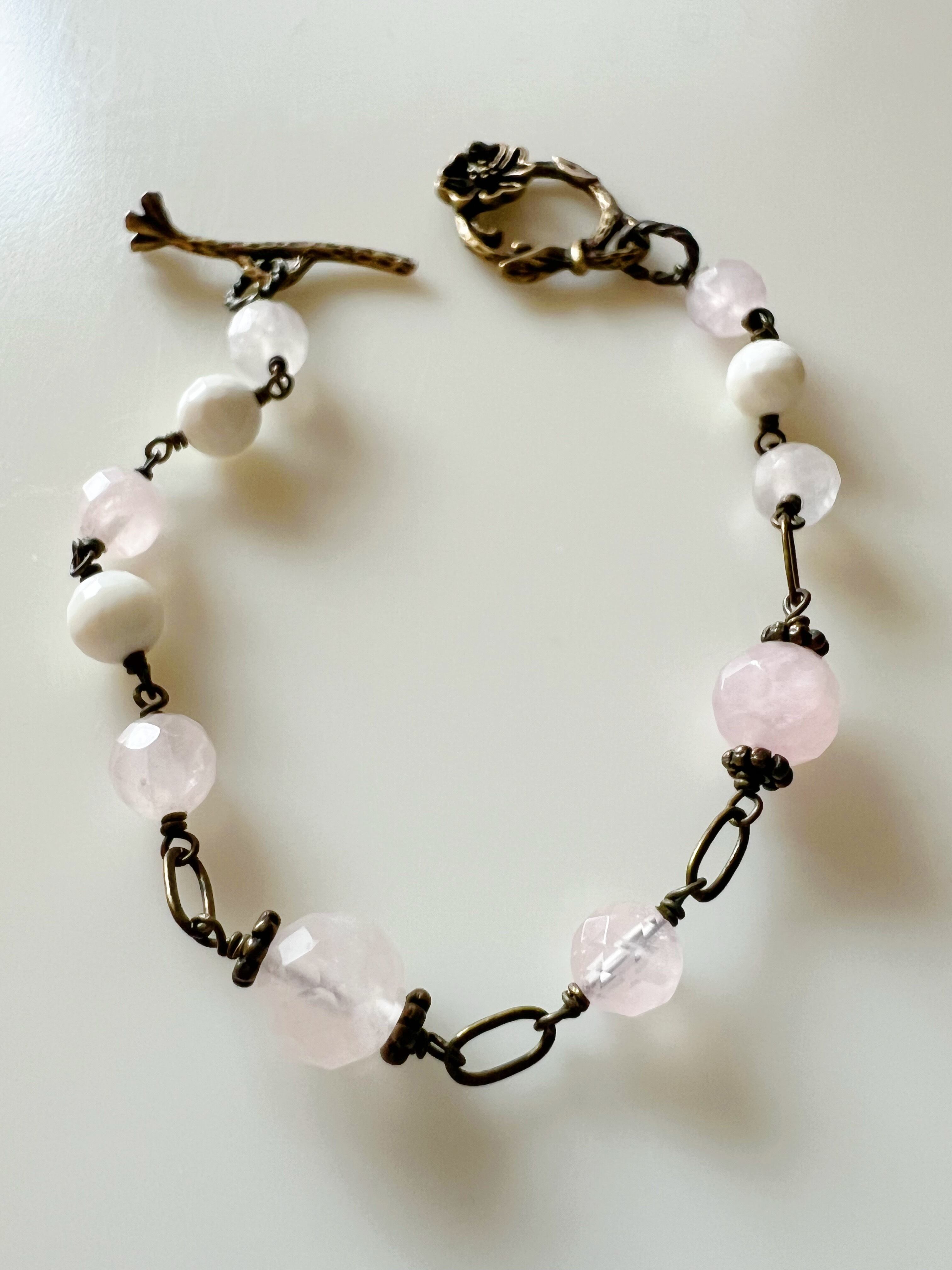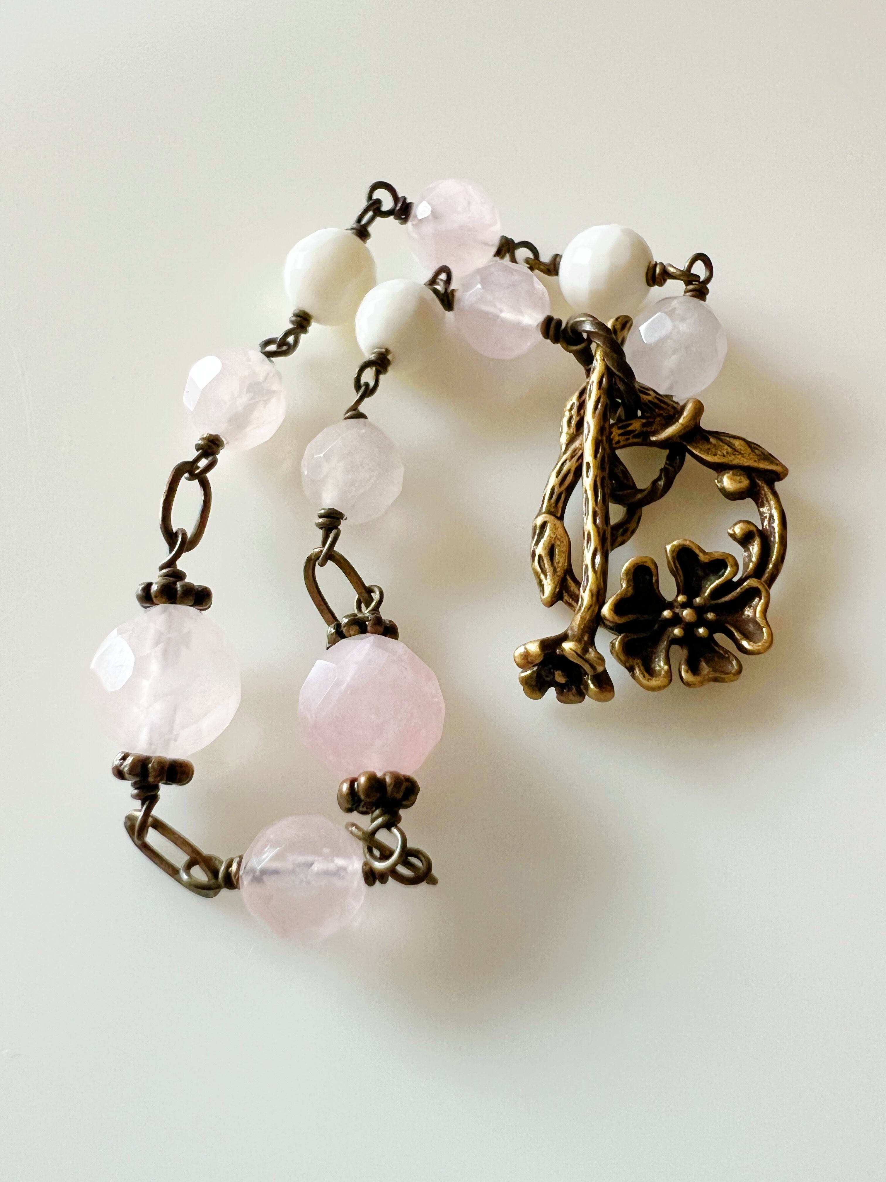 甘く、優雅なローズクオーツと、海の神秘を感じるシェルの組み合わせが魅力のブレスレットです。ローズクオーツは愛の象徴とされ、心と身体を癒し、幸せな気持ちに導いてくれます。シェルは古くから守りのお守りとして愛されており、美しい模様や色合いがアクセントになっています。