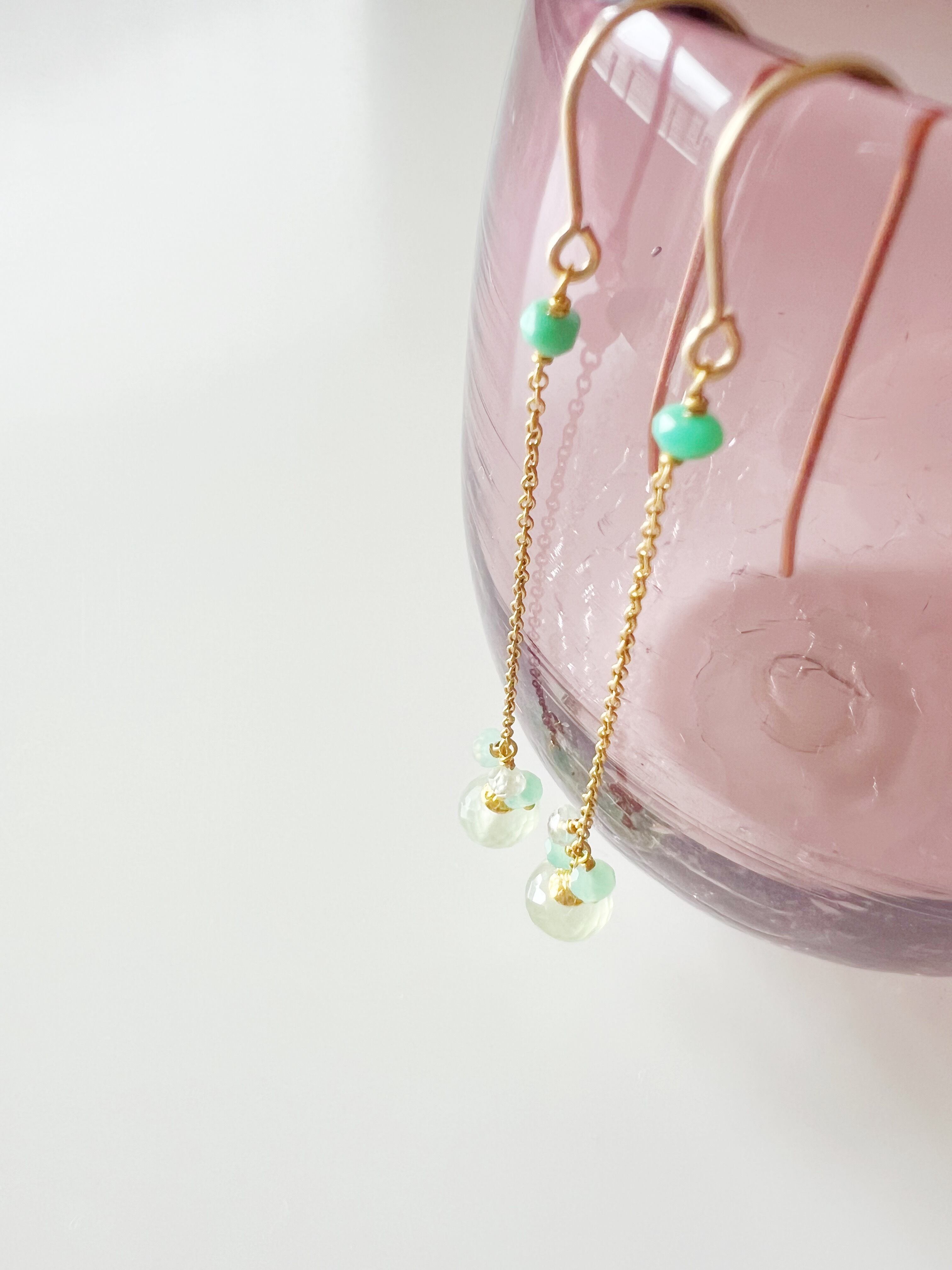 甘くエレガントなデザインが魅力のプレナイトとクリソプレーズのピアス。美しい天然石を使用し、繊細なアートワークで丁寧に作られています。プレナイトの優雅な色合いと、クリソプレーズの繊細な輝きが合わさったこのピアスは、あなたの装いを上品で華やかに彩ります。