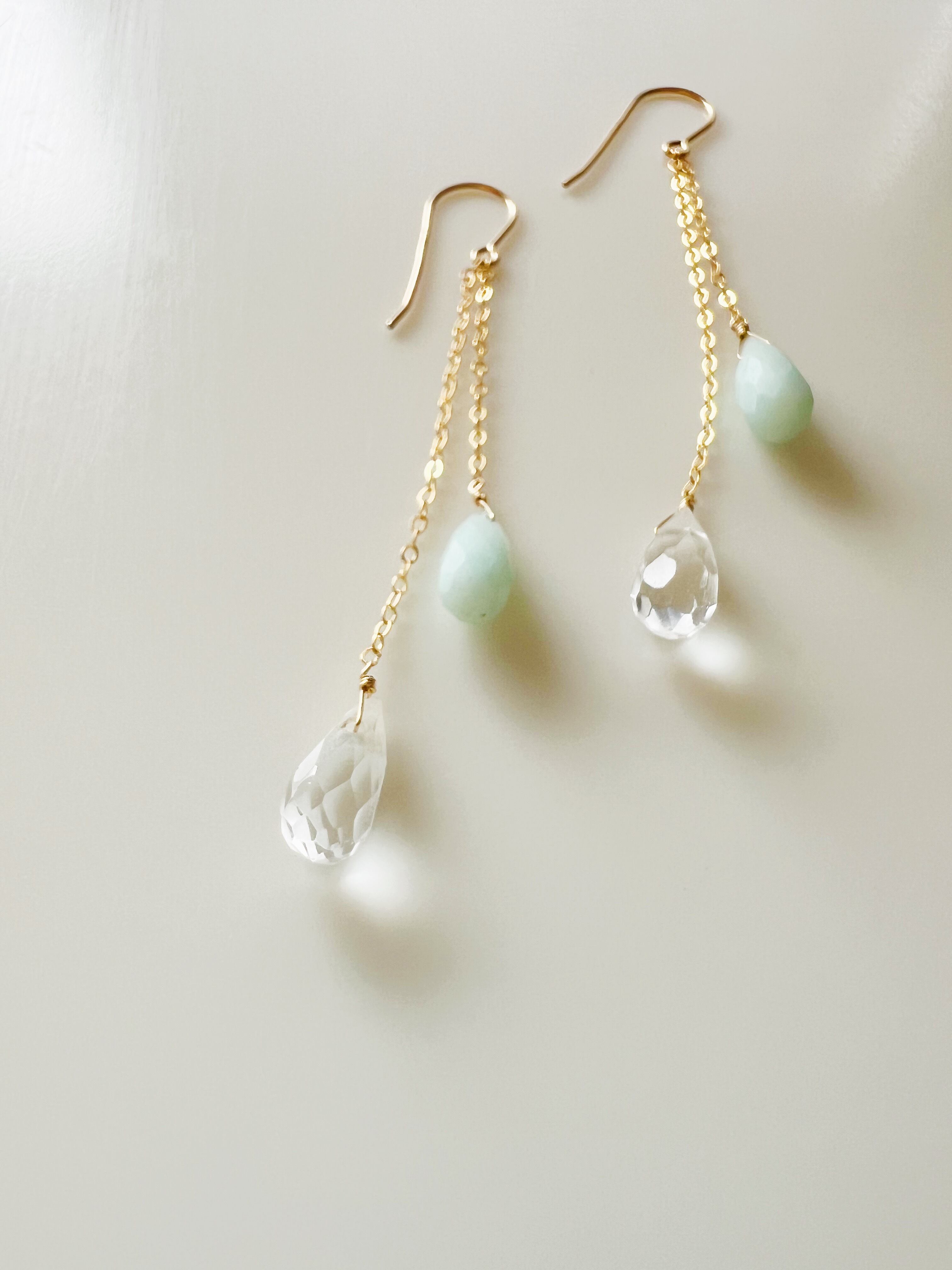 どんなシーンでも自信を持って輝ける、アマゾナイトと水晶のロングピアス。ぜひ、特別な日にしていただきたいと願っております。