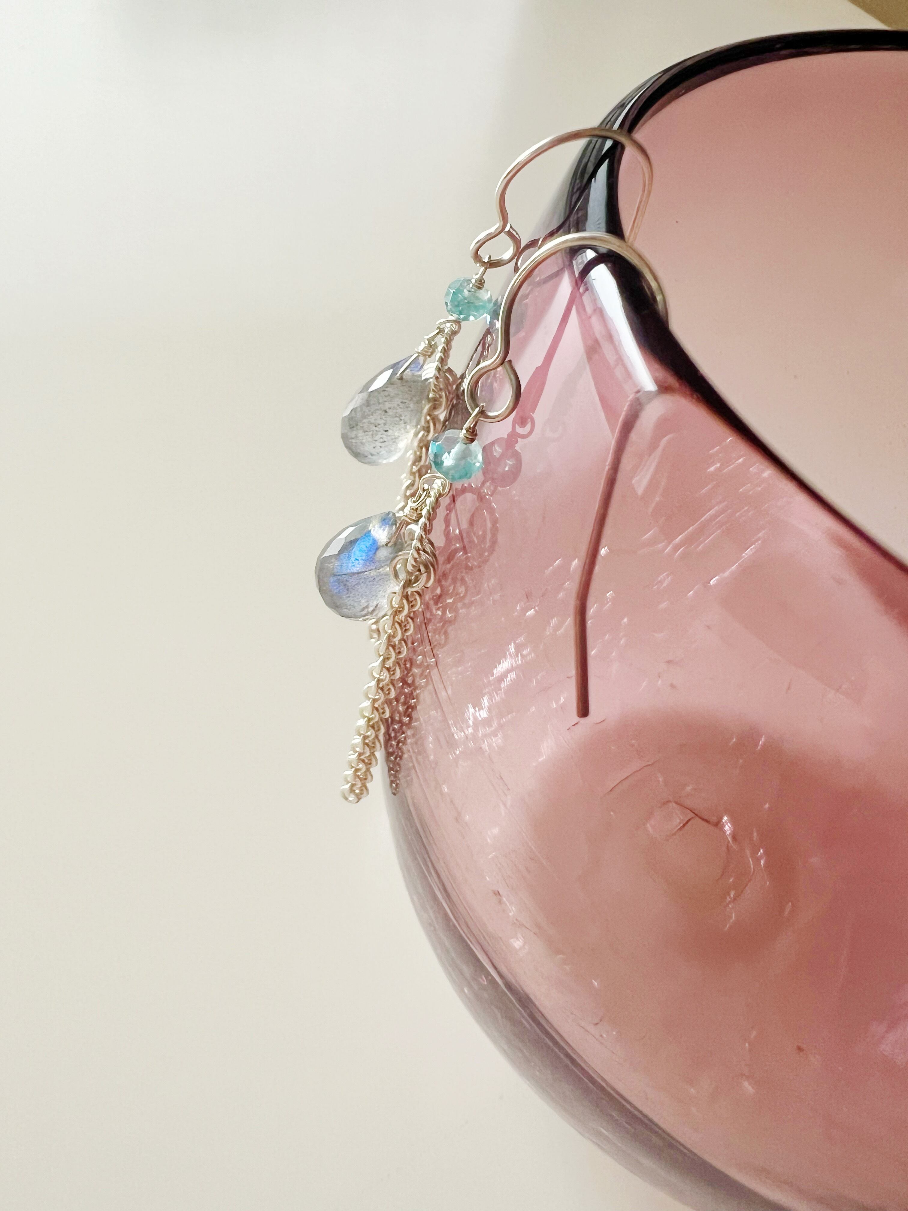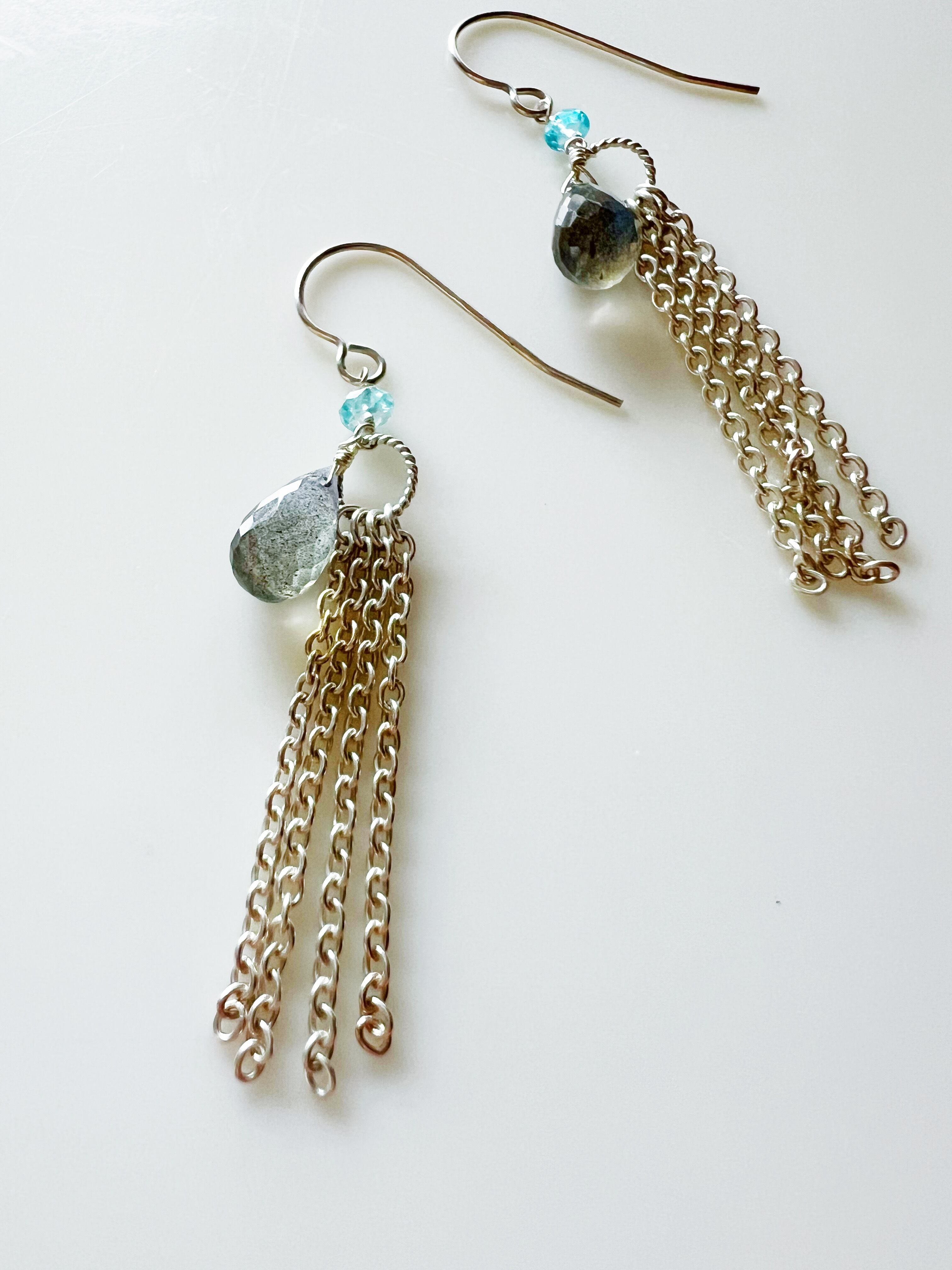 繊細な輝きが魅力のラブラドライトとアパタイトの組み合わせが美しいロングピアスです。シルバーチェーンがピアス全体を引き立て、エレガントな印象を与えます。ラブラドライトの神秘的な輝きは、幸運とパワーをもたらすと言われており、華やかな場にぴったりのアイテムです。シンプルなデザインながらも、存在感のあるロングデザインは、普段使いはもちろんパーティーシーンでも活躍します。