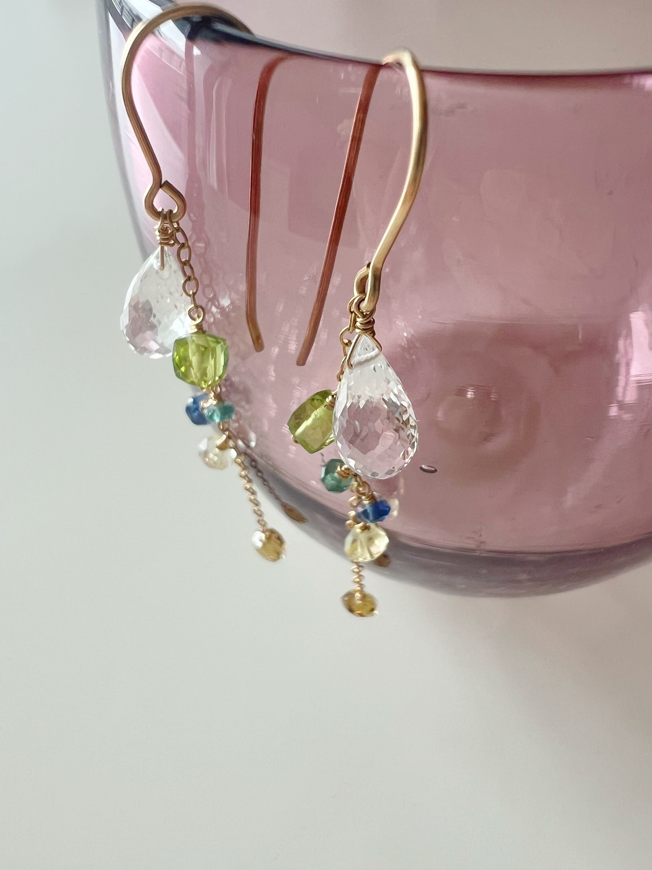 鮮やかな色合いの水晶とペリドット、そして優雅なハニークオーツが融合したロングピアスです。上品で繊細なデザインが、大人の女性にぴったりのアクセサリーです。シンプルながらも存在感を放つこの一点は、普段使いはもちろん、パーティーシーンでも華やかな輝きを放ちます。