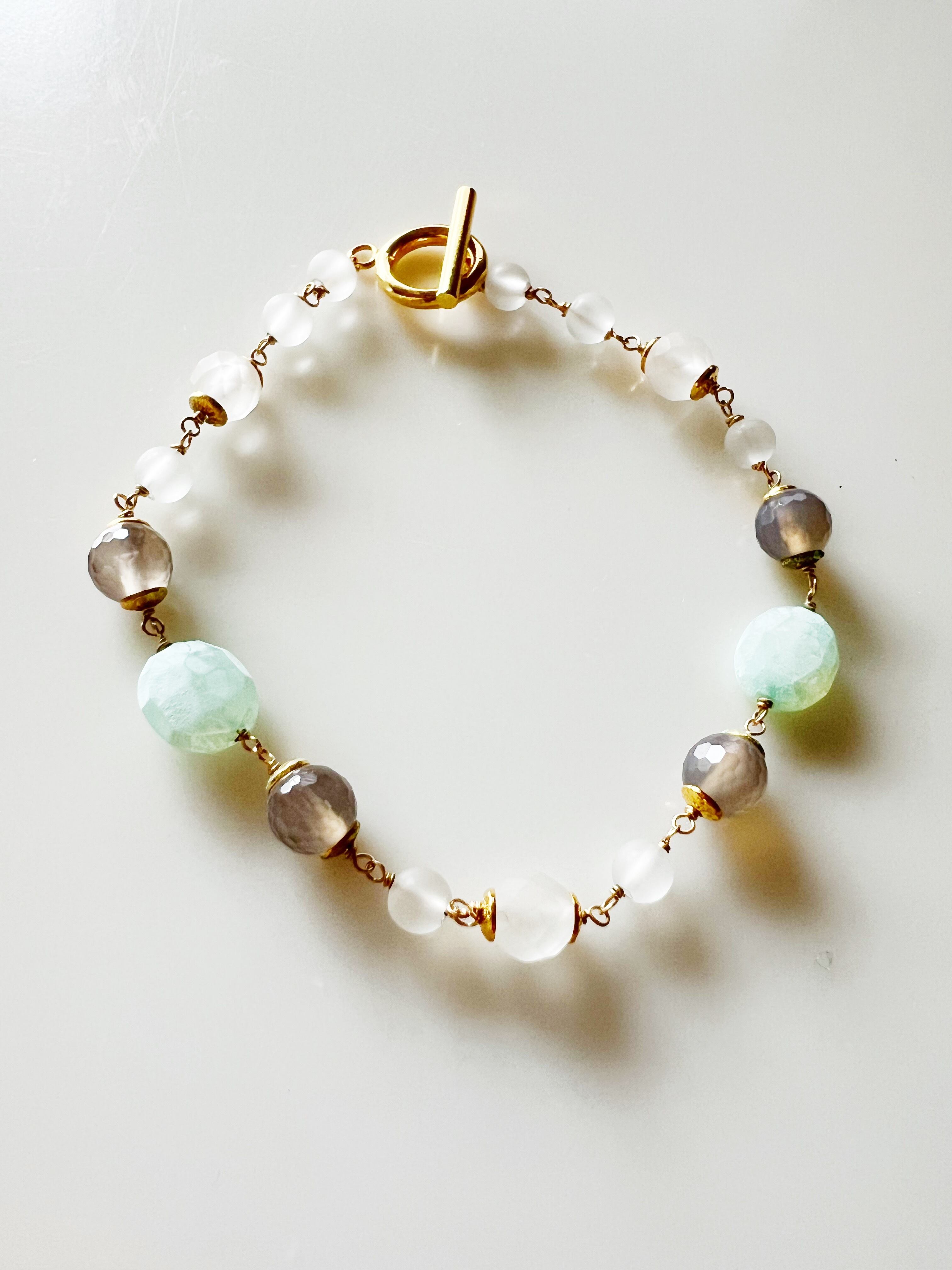天然石の魅力が凝縮されたブレスレット。カルセドニーとグレーオニキス、水晶の組み合わせが上品で華やかな印象を与えます。カルセドニーは心を穏やかにし、気持ちを安定させる効果があり、グレーオニキスは集中力を高め、意志を強くする効果があります。さらに水晶は邪気を払い、浄化効果があります。