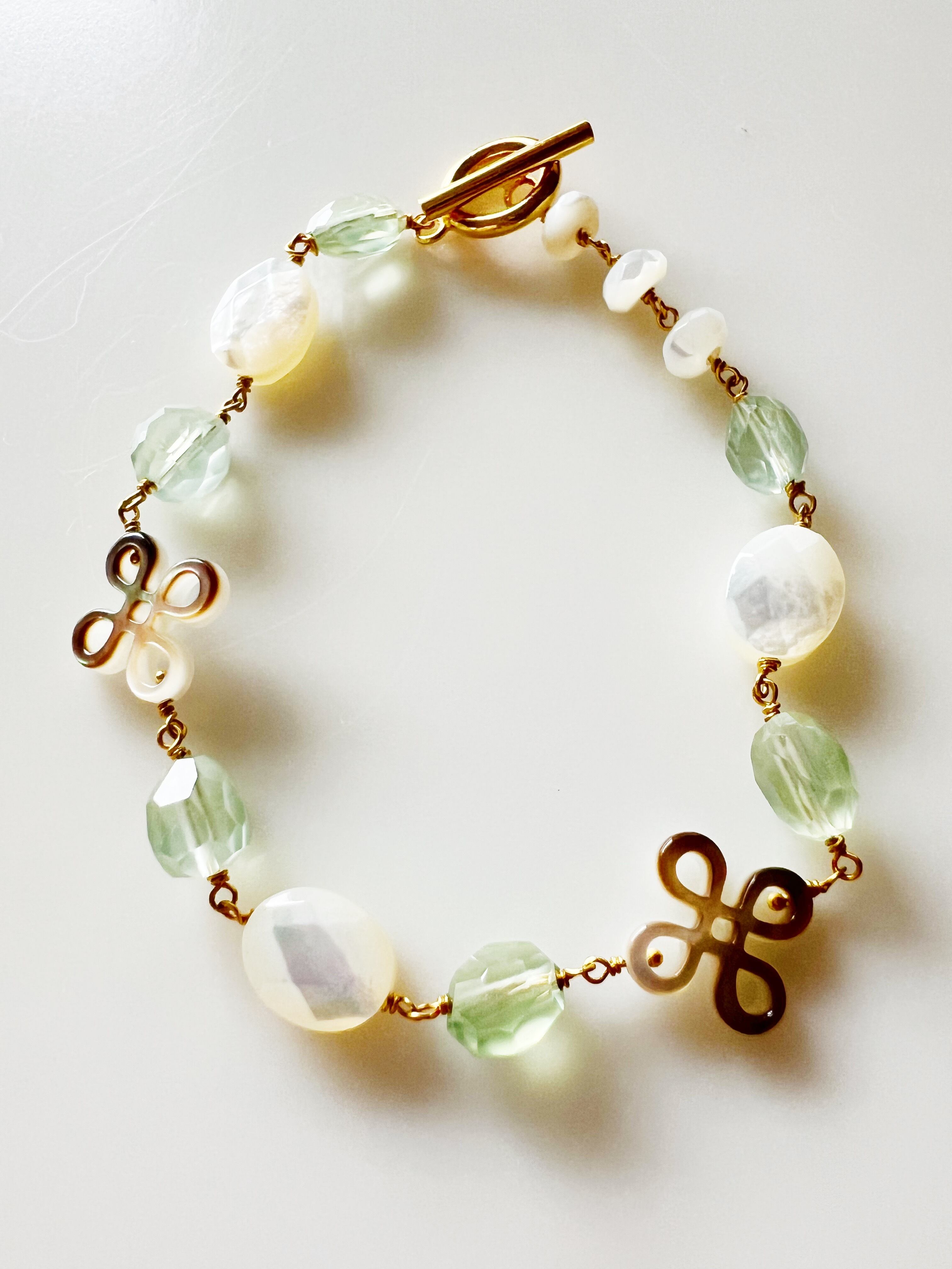 眩しいほど美しい緑色のプレナイトが魅力のブレスレットです。プレナイトは自然の鉱石で採れるため、一つ一つの色や形が異なります。そのため、他とは一味違うオリジナルのアクセサリーをお楽しみいただけます。さらに、ブレスレットには瑞々しいかがやきを添えるシェルパーツも使用しています。シェルパーツの輝きとプレナイトの鮮やかな緑が絶妙に調和し、女性らしい華やかさを演出します。