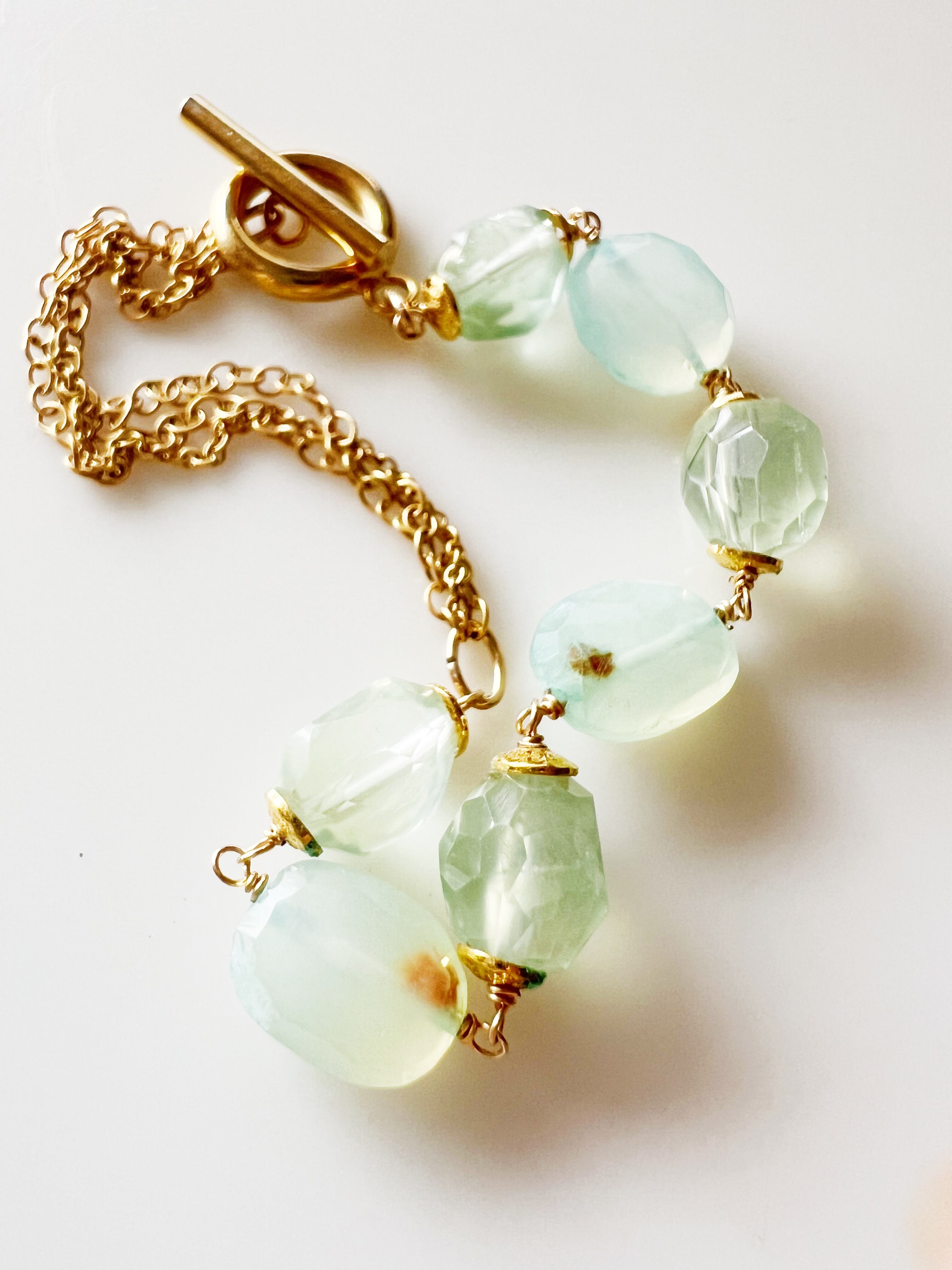 プレナイトとカルセドニーのグリーンのブレスレット。自然石を使用した、上品でエレガントなアクセサリーです。プレナイトは心地良い癒しの石として知られており、ストレスを軽減し、リラックス効果も期待できます。また、カルセドニーは幸運や希望をもたらすとされており、持ち主の運気を上昇させるパワーストーンとして注目されています。このブレスレットは、石の色味や模様が個体によって異なるため、一点一点がオリジナルであり、特別な存在感を放ちます。その美しい色合いと石の力を身につければ、毎日のコーディネートもより華やかになることでしょう。自分へのご褒美や大切な人へのギフトにも最適です。