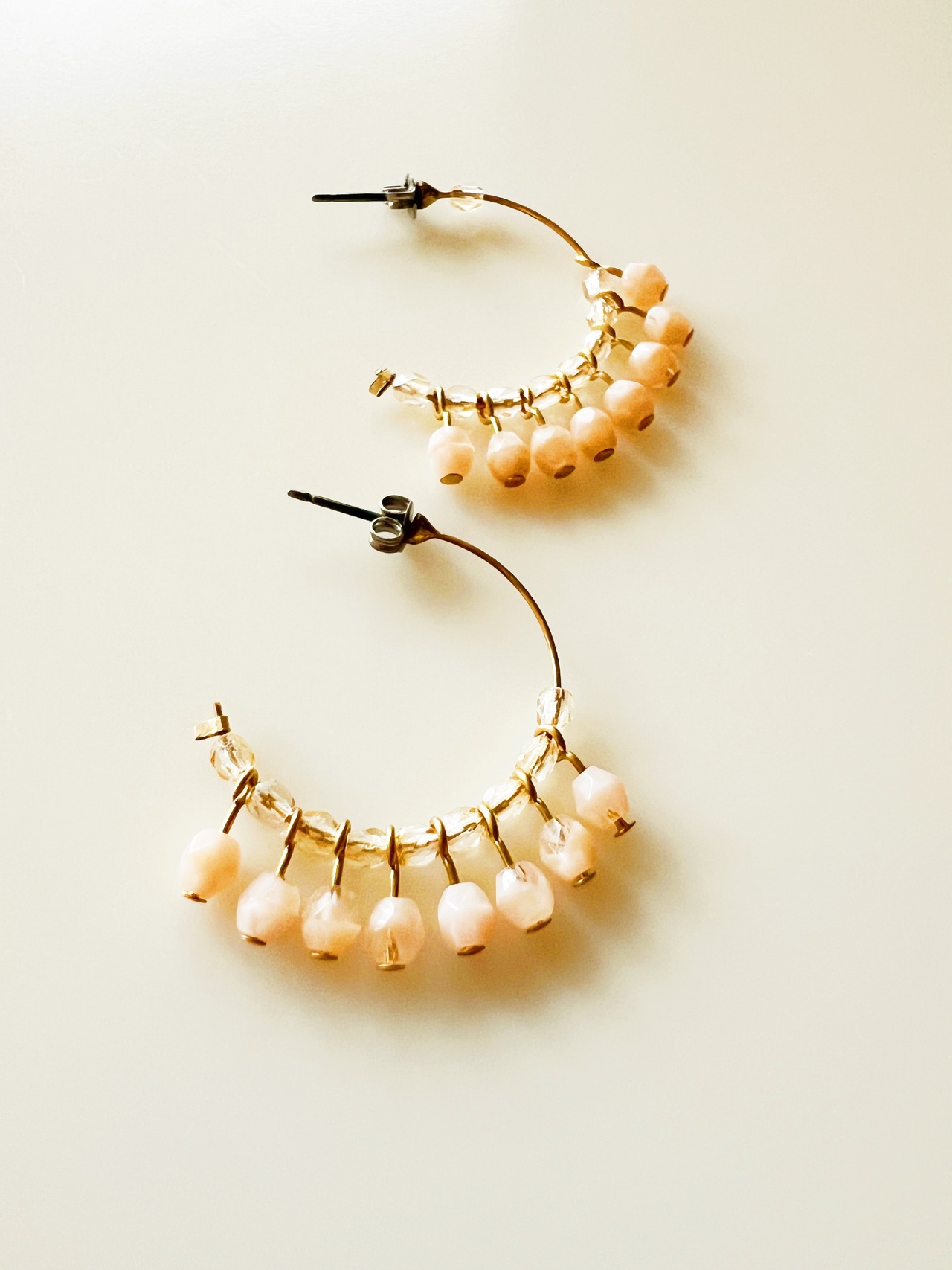 このピアスは、丁寧に選び抜かれたチェコガラスビーズを使用しており、職人の手作業によって一つ一つ丁寧に作られています。そのため、他のどのピアスとも差がつく特別感を持っています。また、チェコガラスビーズはその美しさだけでなく、軽やかな付け心地も魅力です。また、フープのサイズ感も絶妙で、しっかりと存在感を感じつつも、装着時の負担を軽減しています。