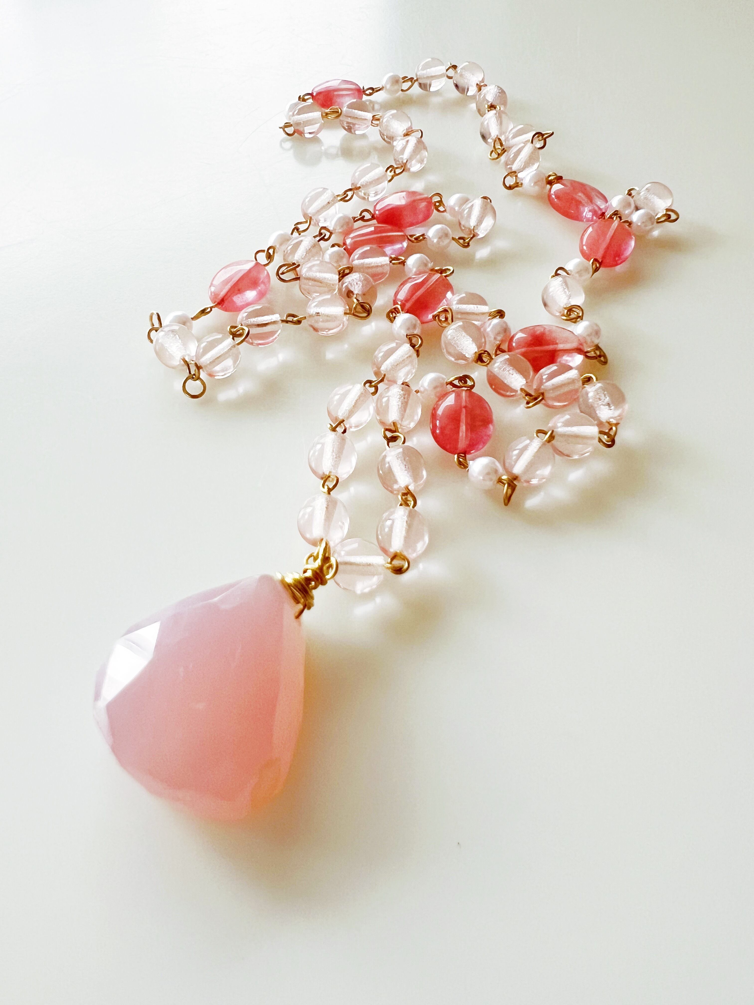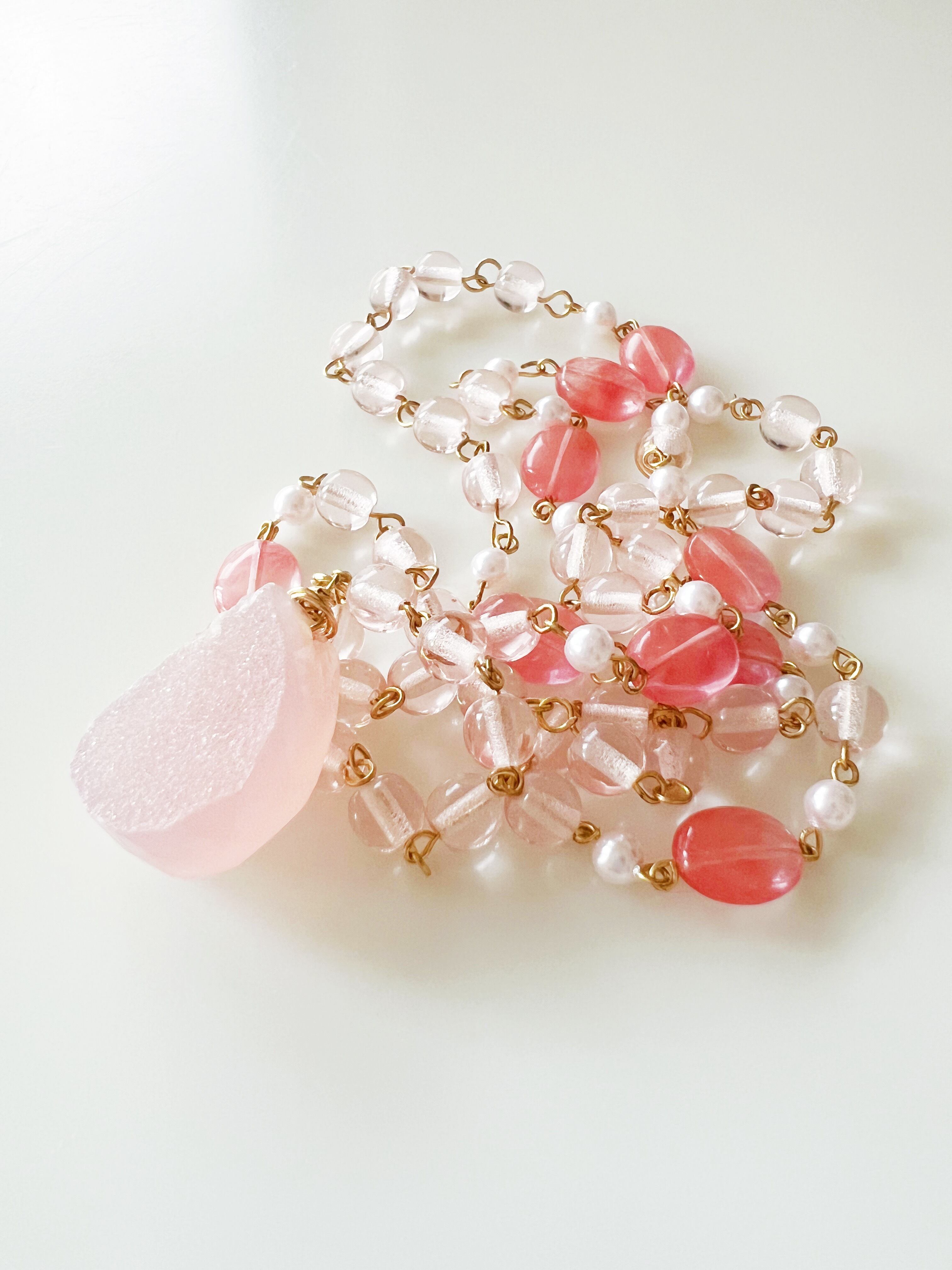 大人っぽさと可愛らしさが共存する、ピンクカルセドニーとガラスビーズのネックレスです。ピンクのカルセドニーと透明なガラスビーズが上品な輝きを放ち、女性らしさを引き立てます。長さ調節可能なチェーンで、様々なスタイルに合わせられます。普段使いはもちろん、特別な日のアクセントにもおすすめです。手作り感のあるデザインは、一つ一つが個性的でおしゃれです。あなたの魅力を引き出すアイテムとして、ぜひご活用ください。