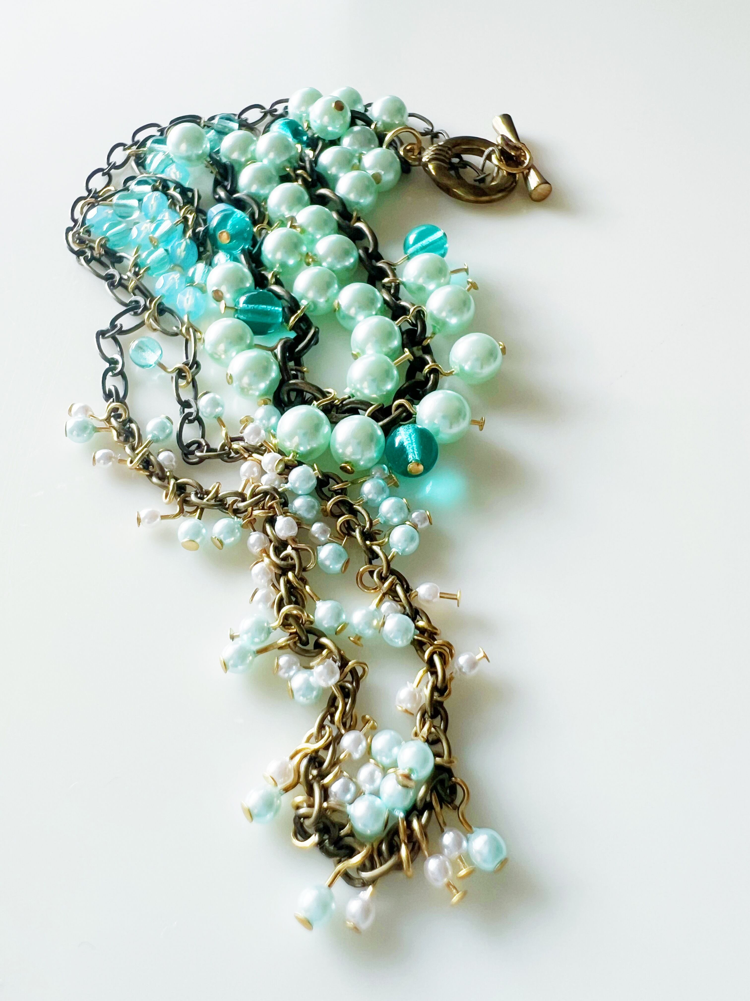 目を引く輝きと華やかさが特徴のブルー系のチェコビーズとパールが織りなす、贅沢なロングネックレスです。豪華なデザインと洗練されたカラーリングが、フォーマルなシーンからカジュアルなコーディネートまで幅広いスタイルにマッチします。