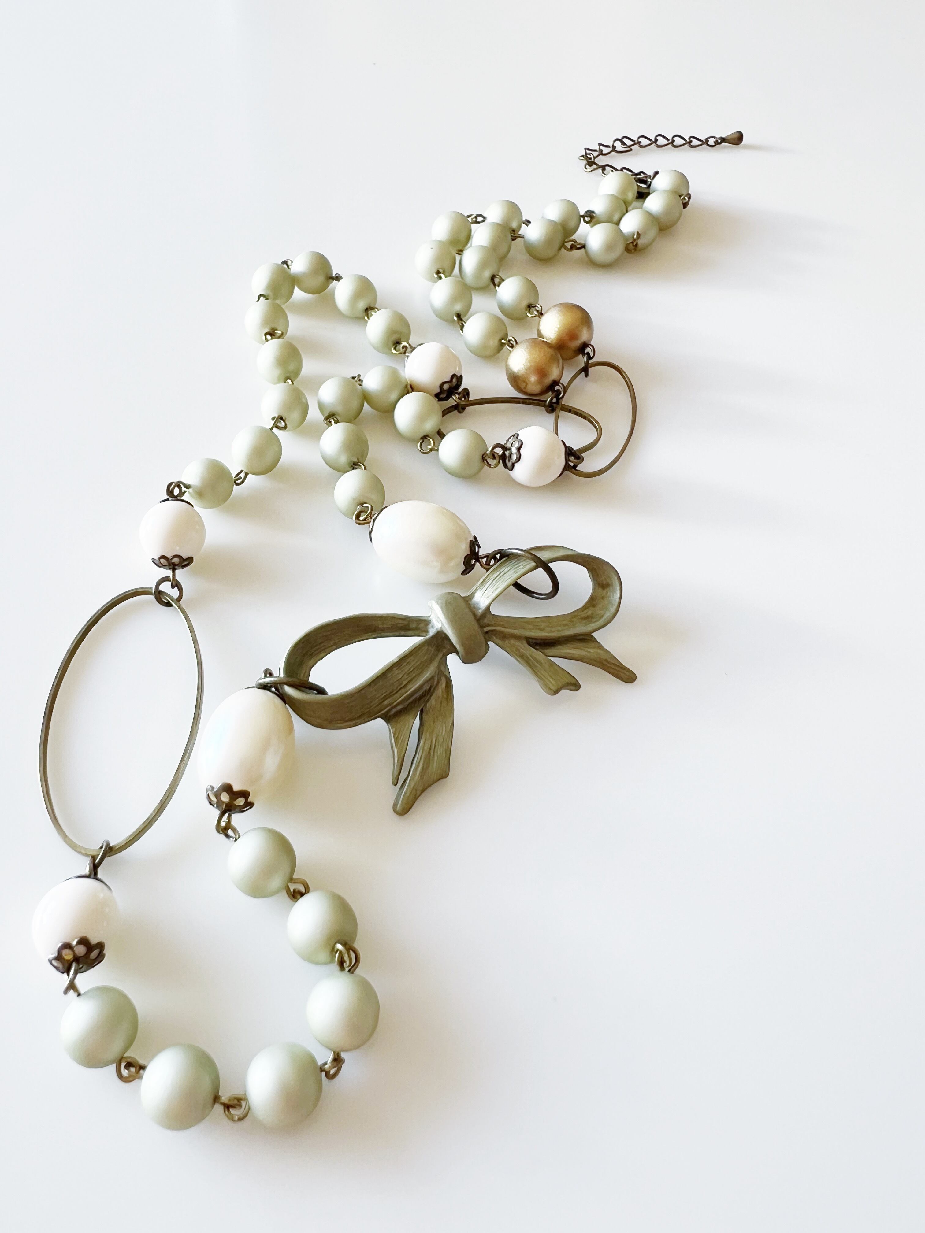 美しいグリーンのリボンとビーズで飾られた、軽やかでエレガントなロングネックレス。優しい緑が印象的。