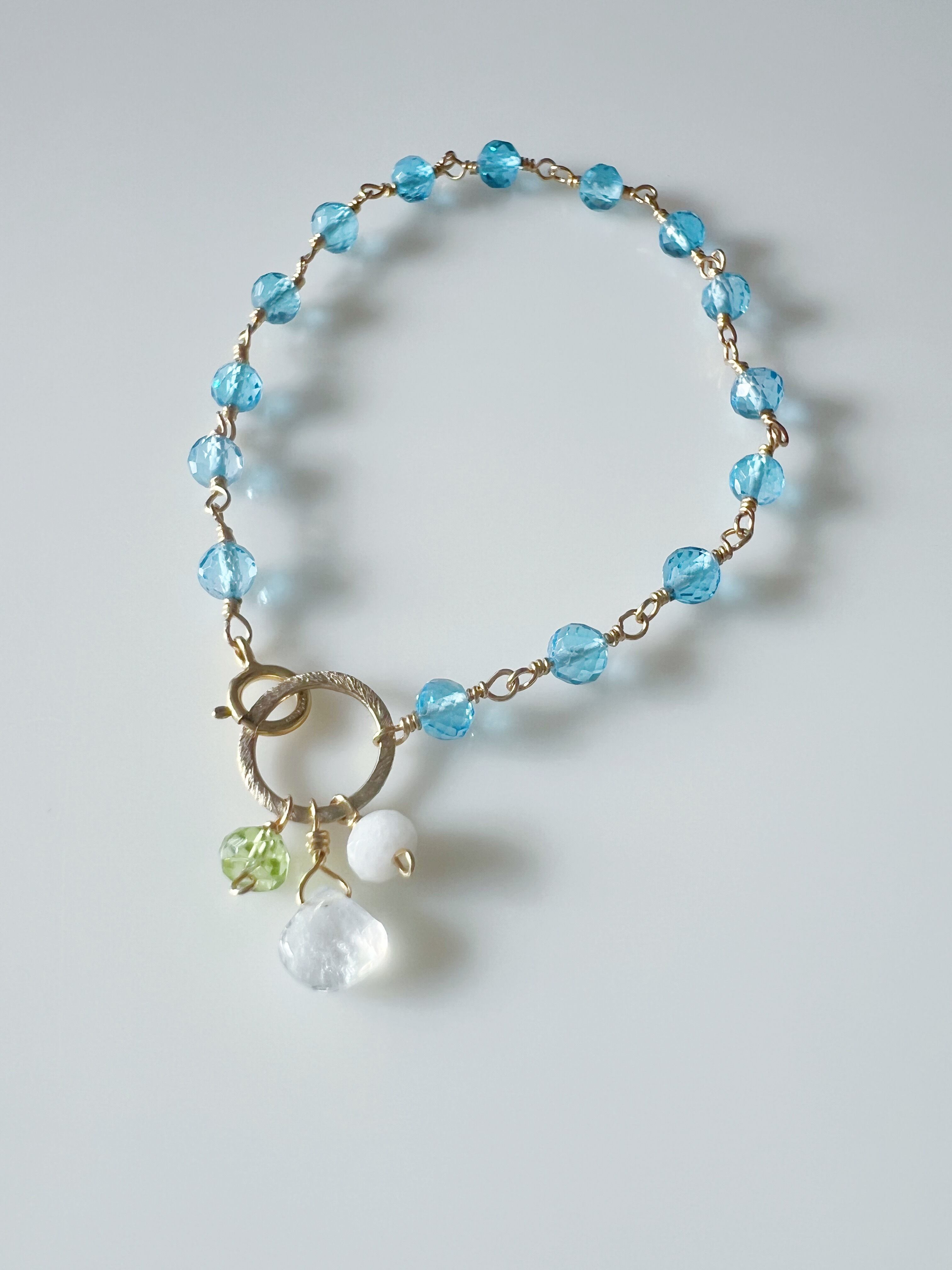 ブルークオーツ、ムーンストーン、ペリドット、ホワイトクオーツのブレスレットは、4つの天然石で涼しげな印象。