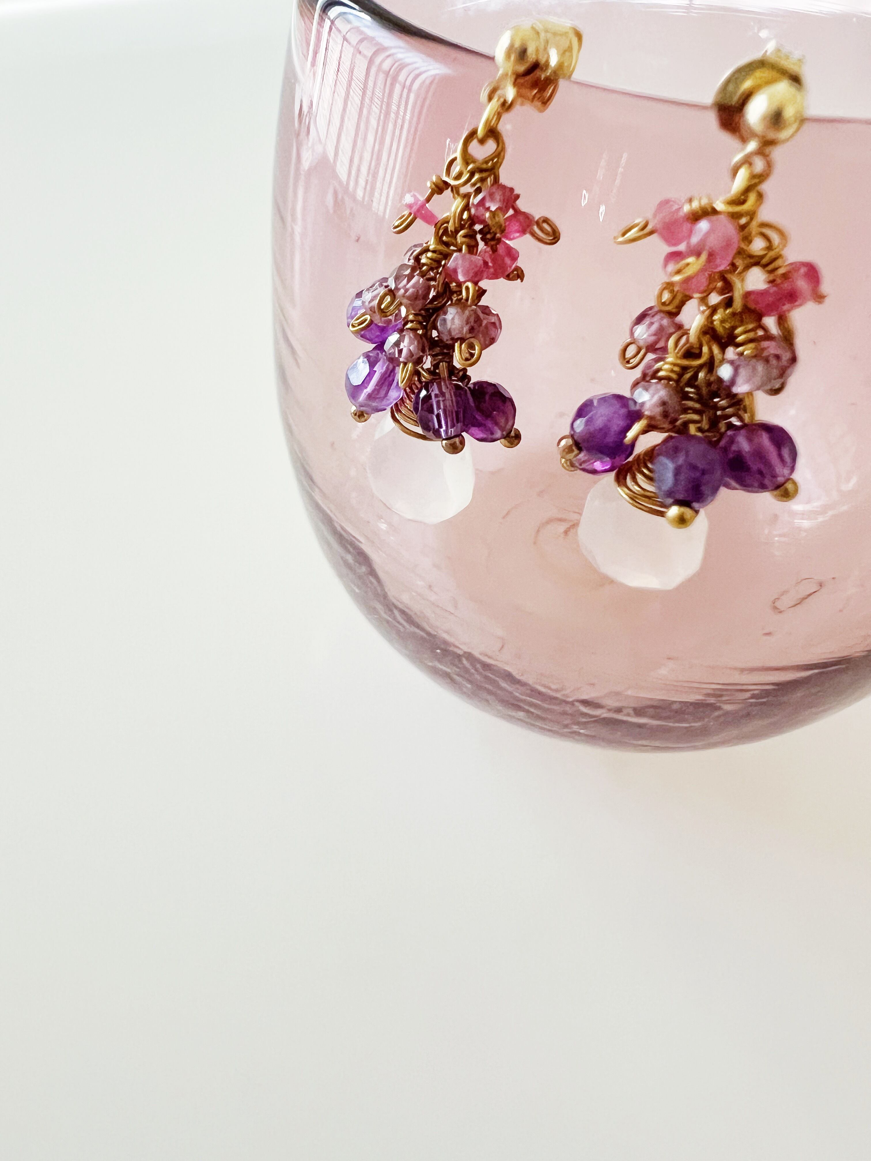 天然のカルセドニーとアメシストを使用した、果実をイメージしたデザインのピアス。