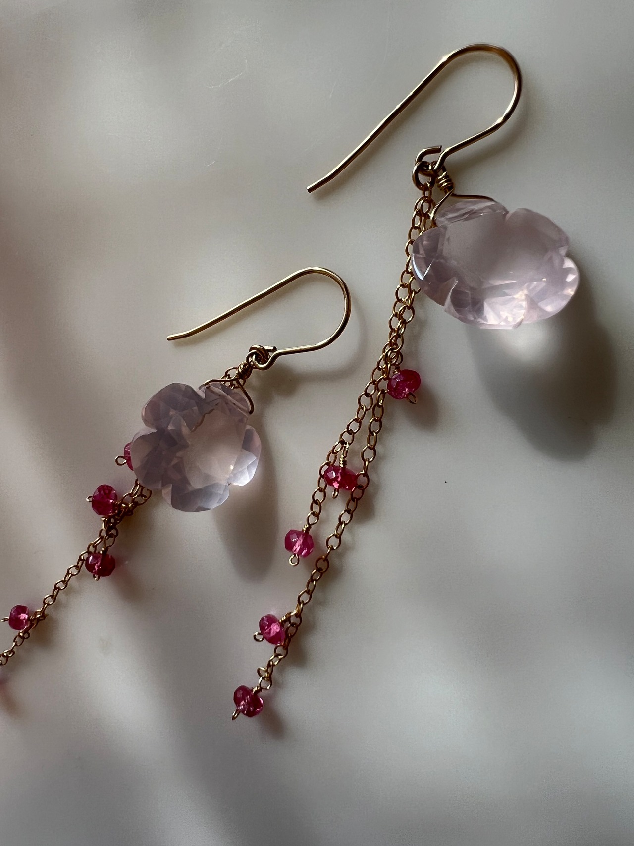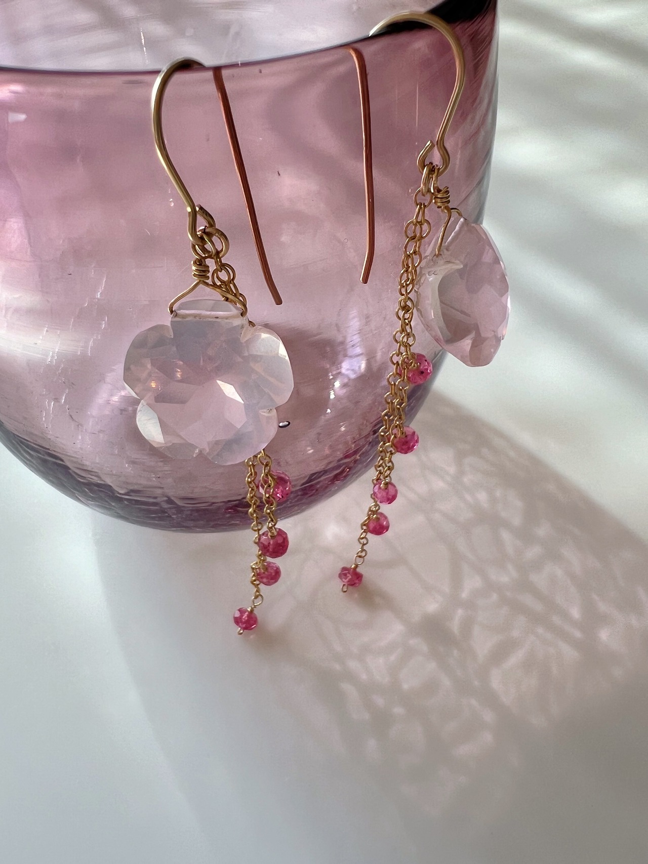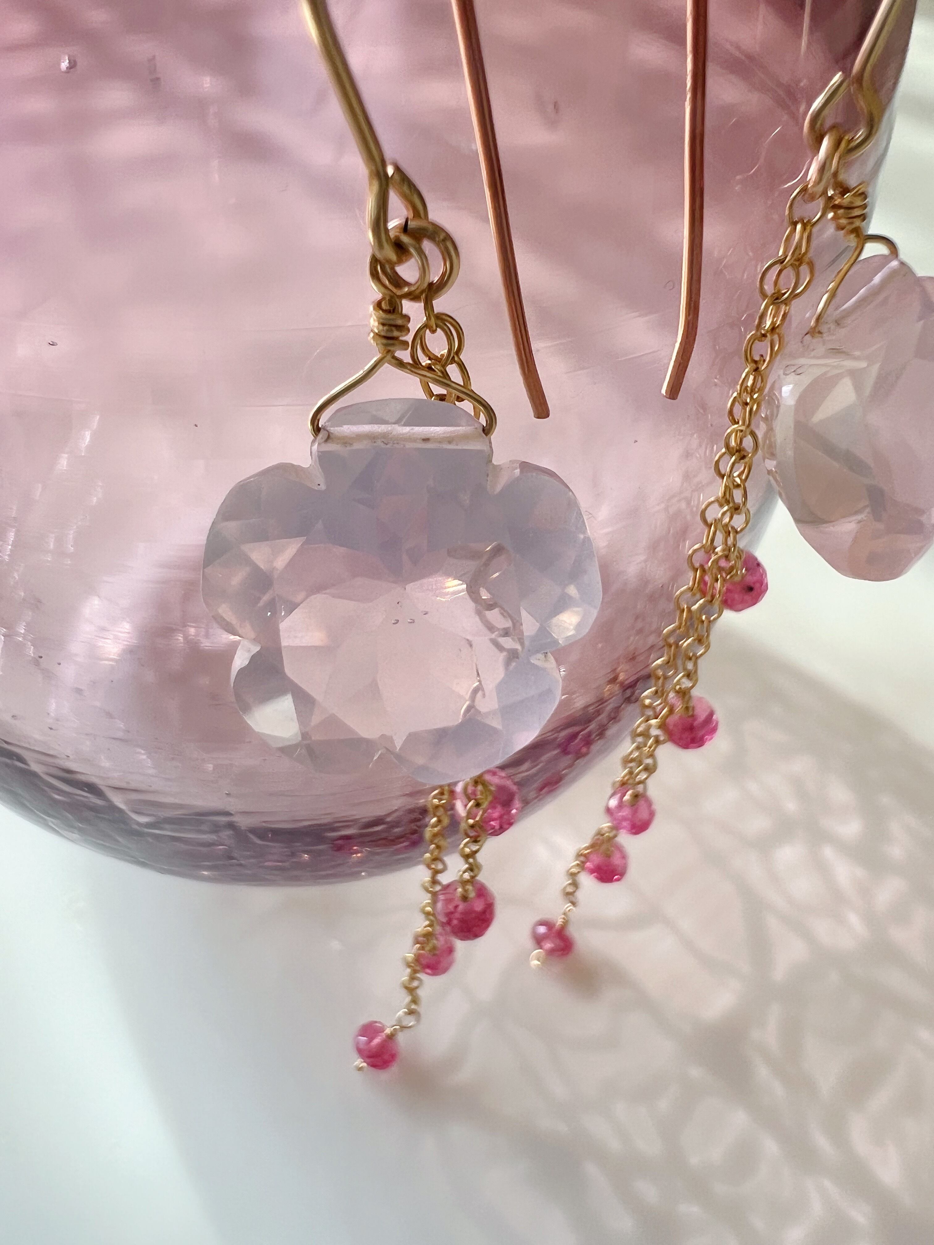 大粒のローズクオーツとピンククオーツが美しく輝く、フラワーカットのピアスが登場