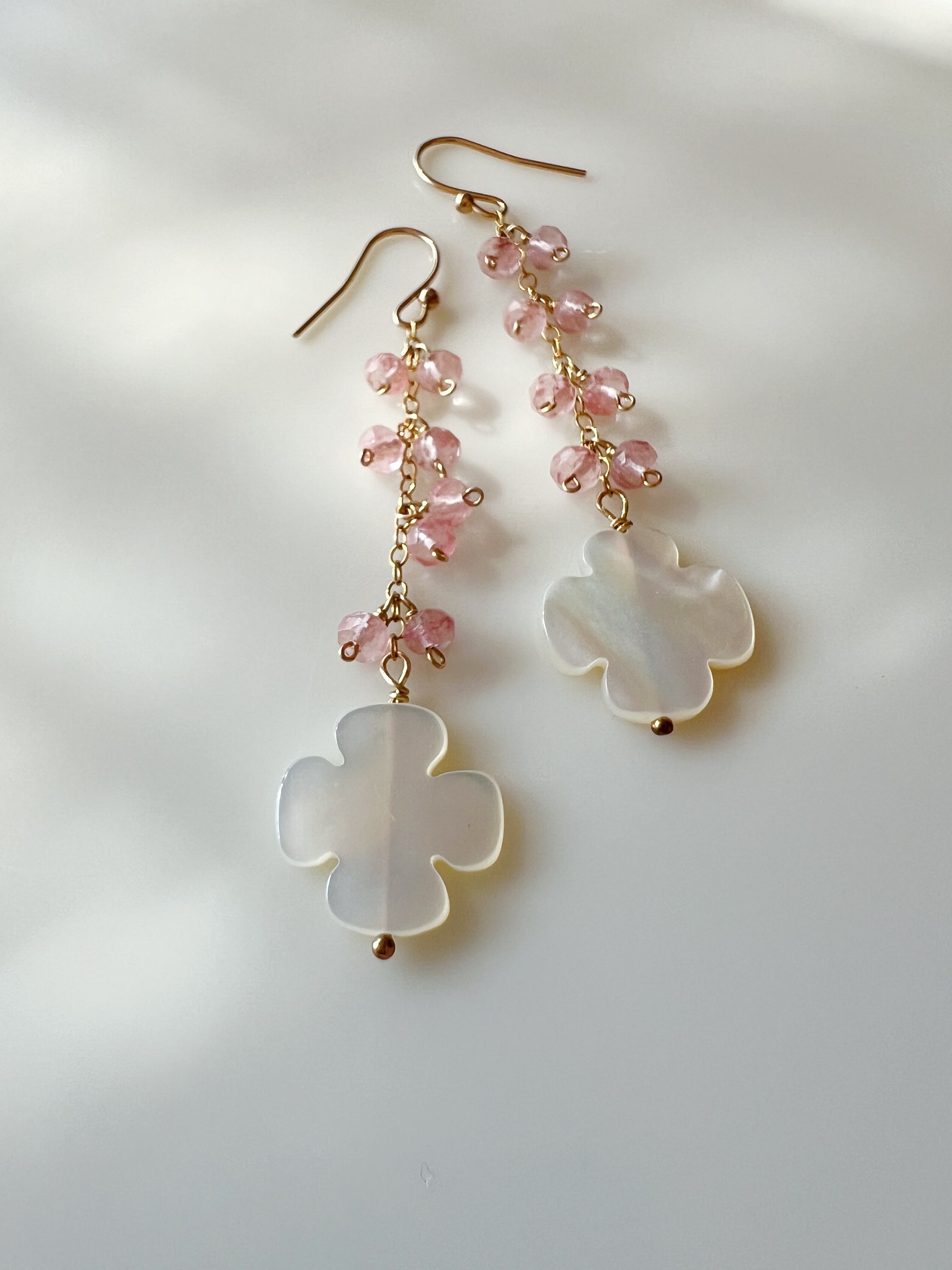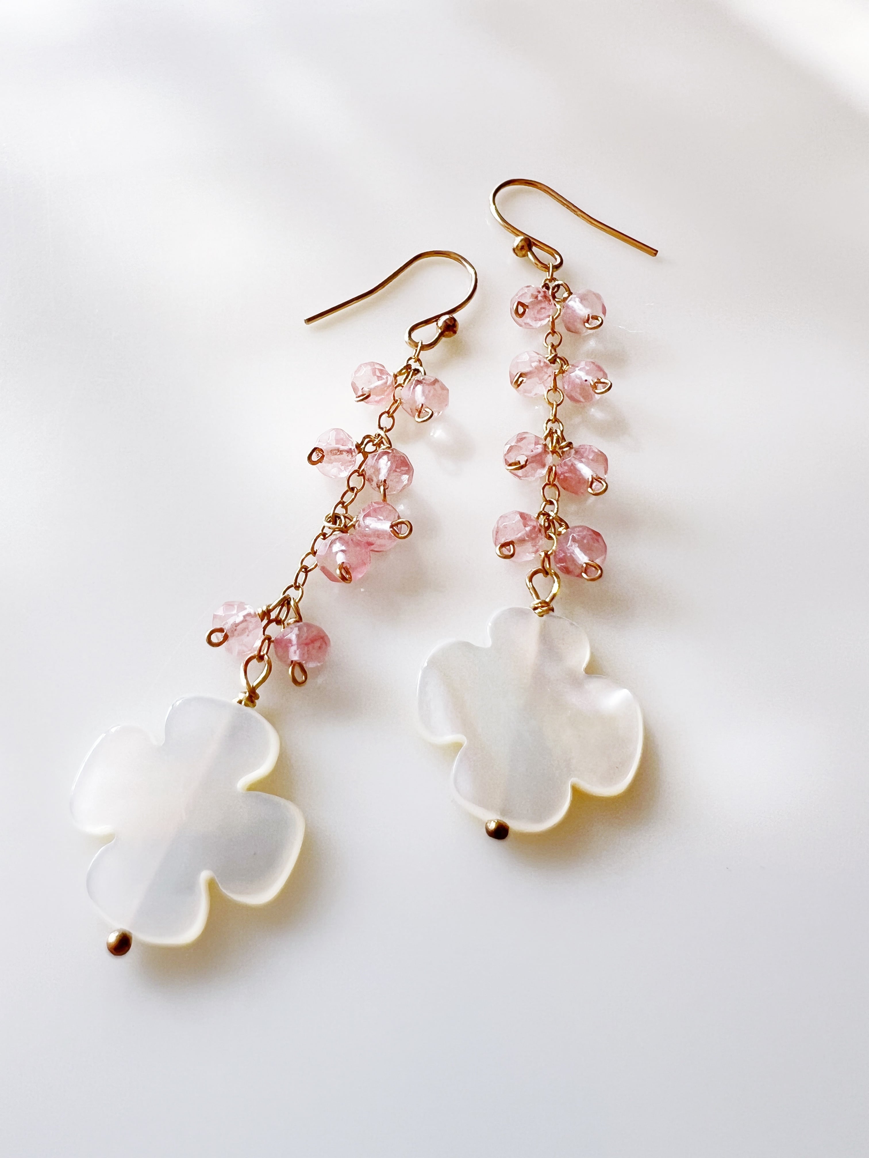 儚く美しい夏の装いを彩る、お花のシェルとピンククオーツのロングピアス。