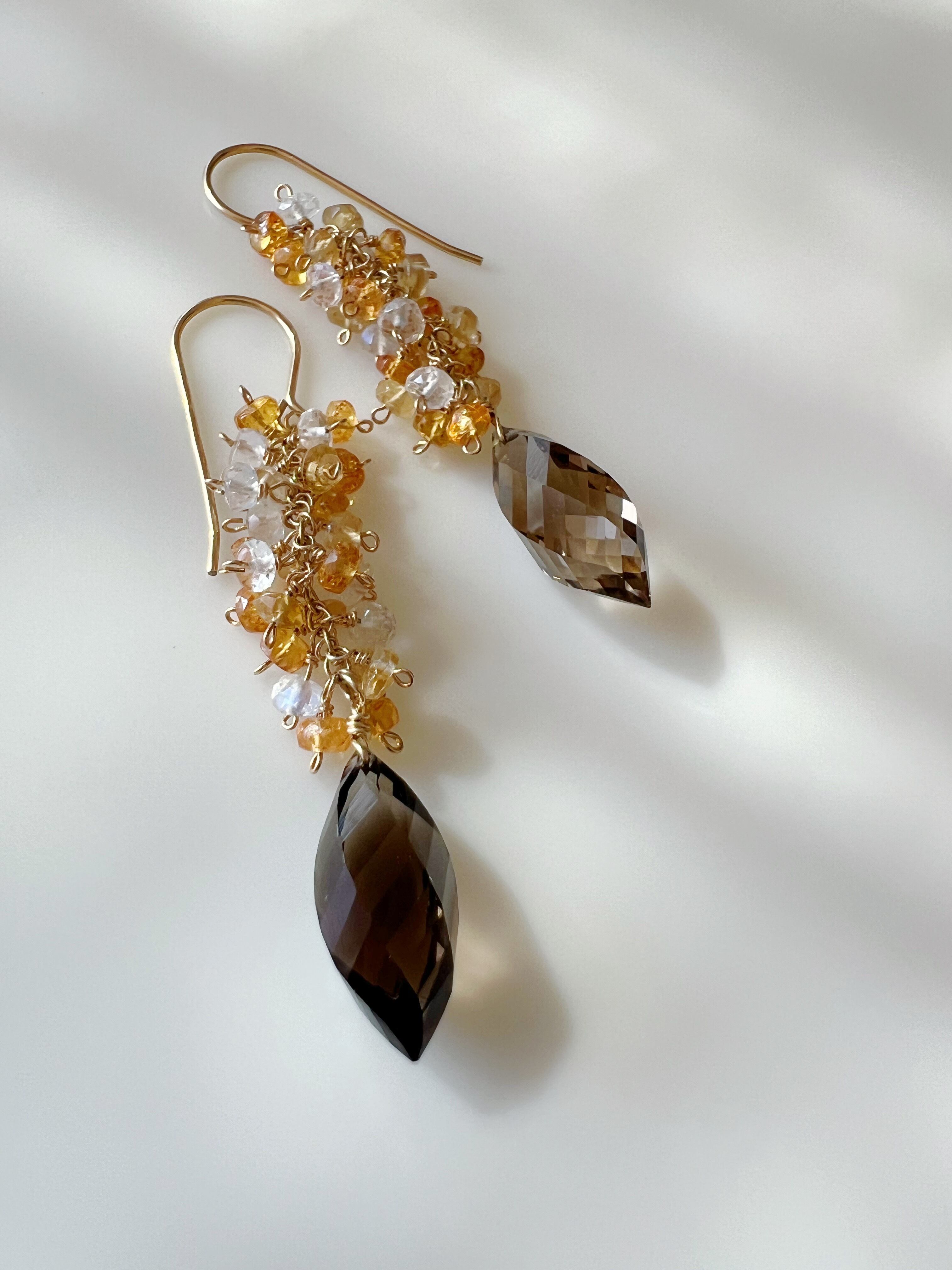スモーキークオーツとカーネリアンの美しいカットが輝くピアス。揺れる度に微細な光がちらちらと舞う、存在感のあるアイテムです。大人っぽい雰囲気を漂わせながら、華やかさもしっかりと感じられるデザインは、どんなシーンにもマッチします。