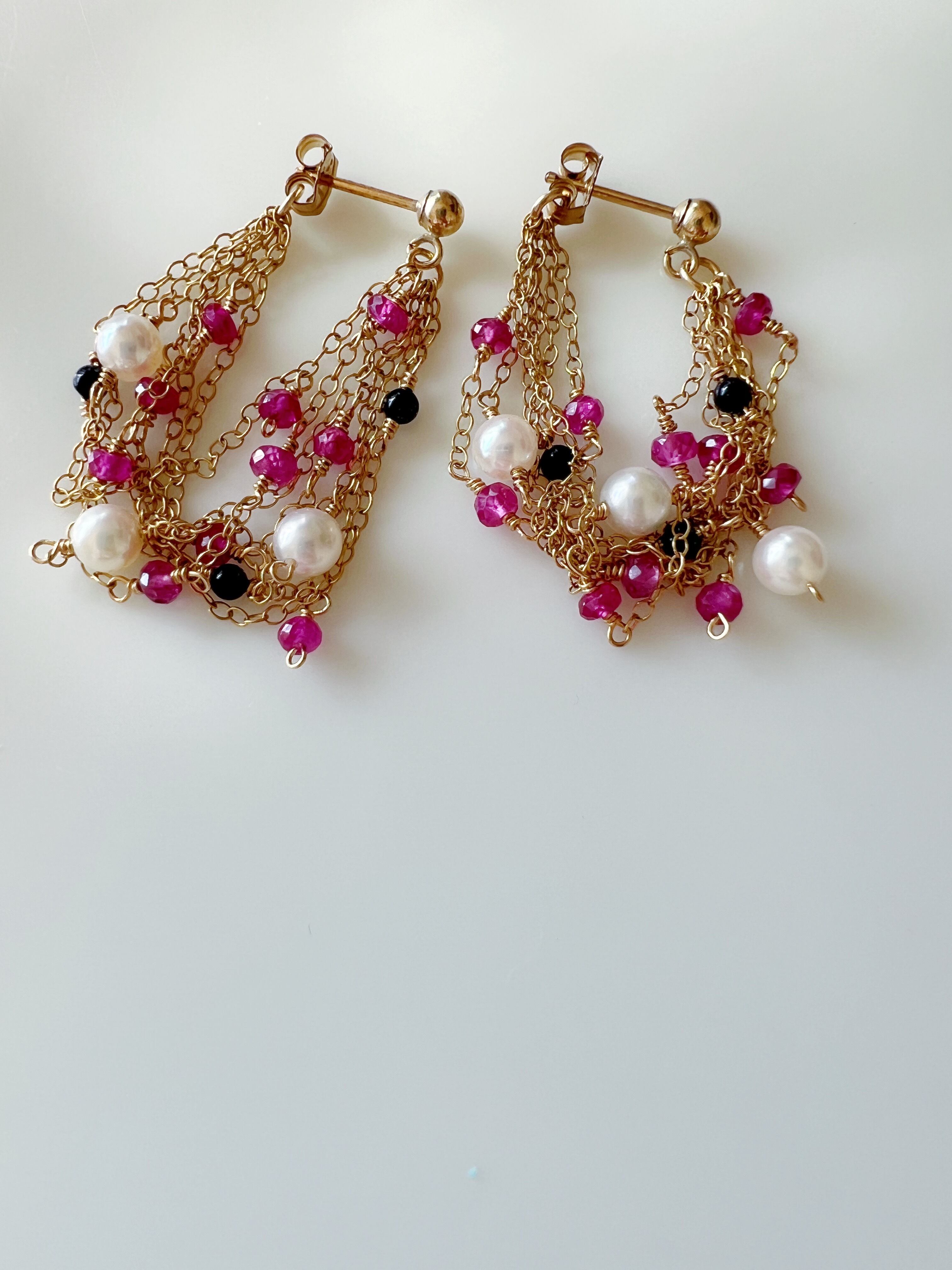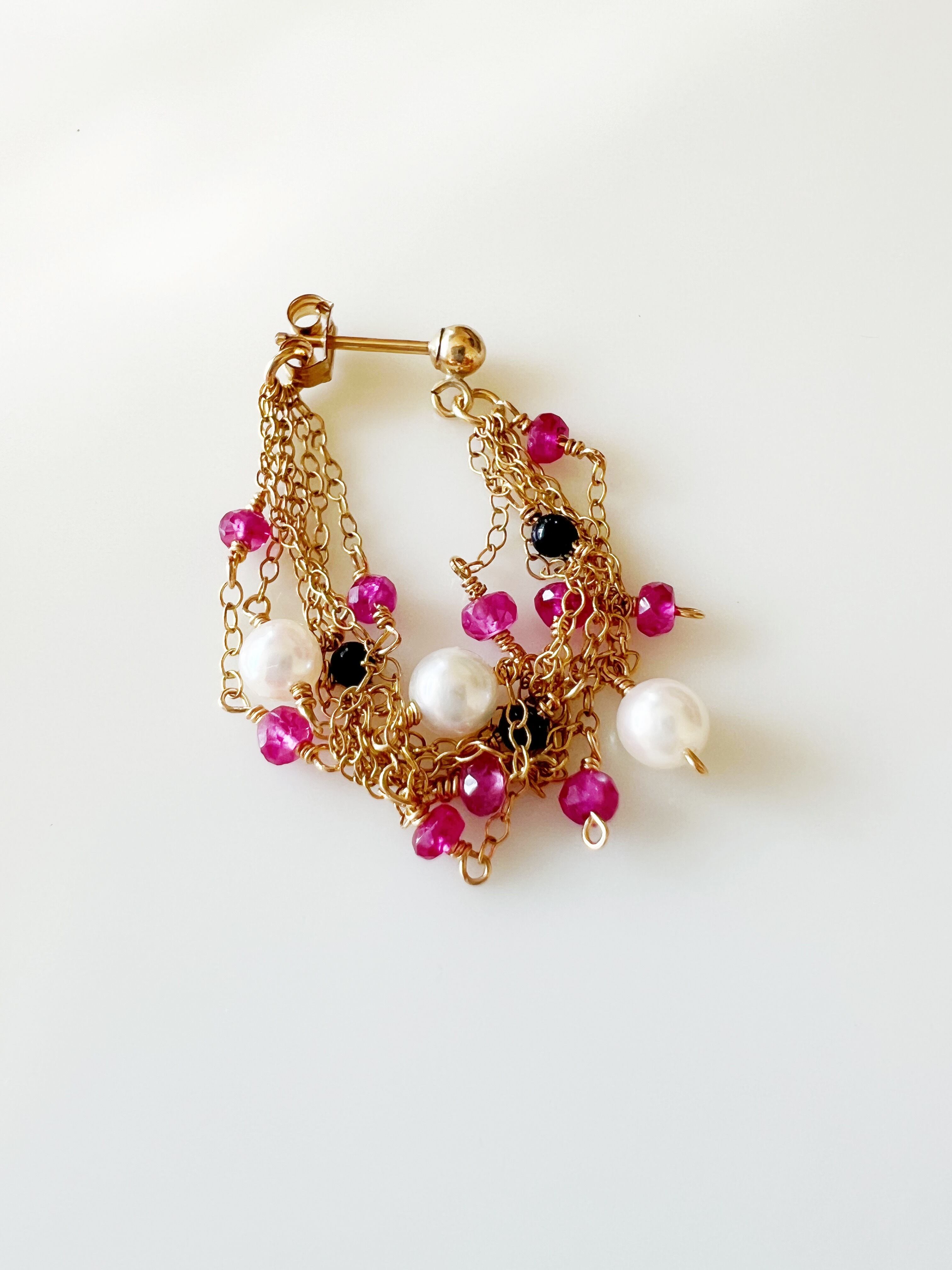 上品な淡水パールと華やかなスピネルが輝く、チェーンピアスの登場です。