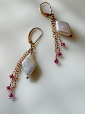 ルビーの赤と淡水パールの美しい組み合わせが魅力の菱形ピアス。エレガントで女性らしいアクセサリーです。ルビーは愛の石と言われ、淡水パールは清らかな心を象徴しています。どちらも上品な輝きを放ち、耳元で品格を演出します。