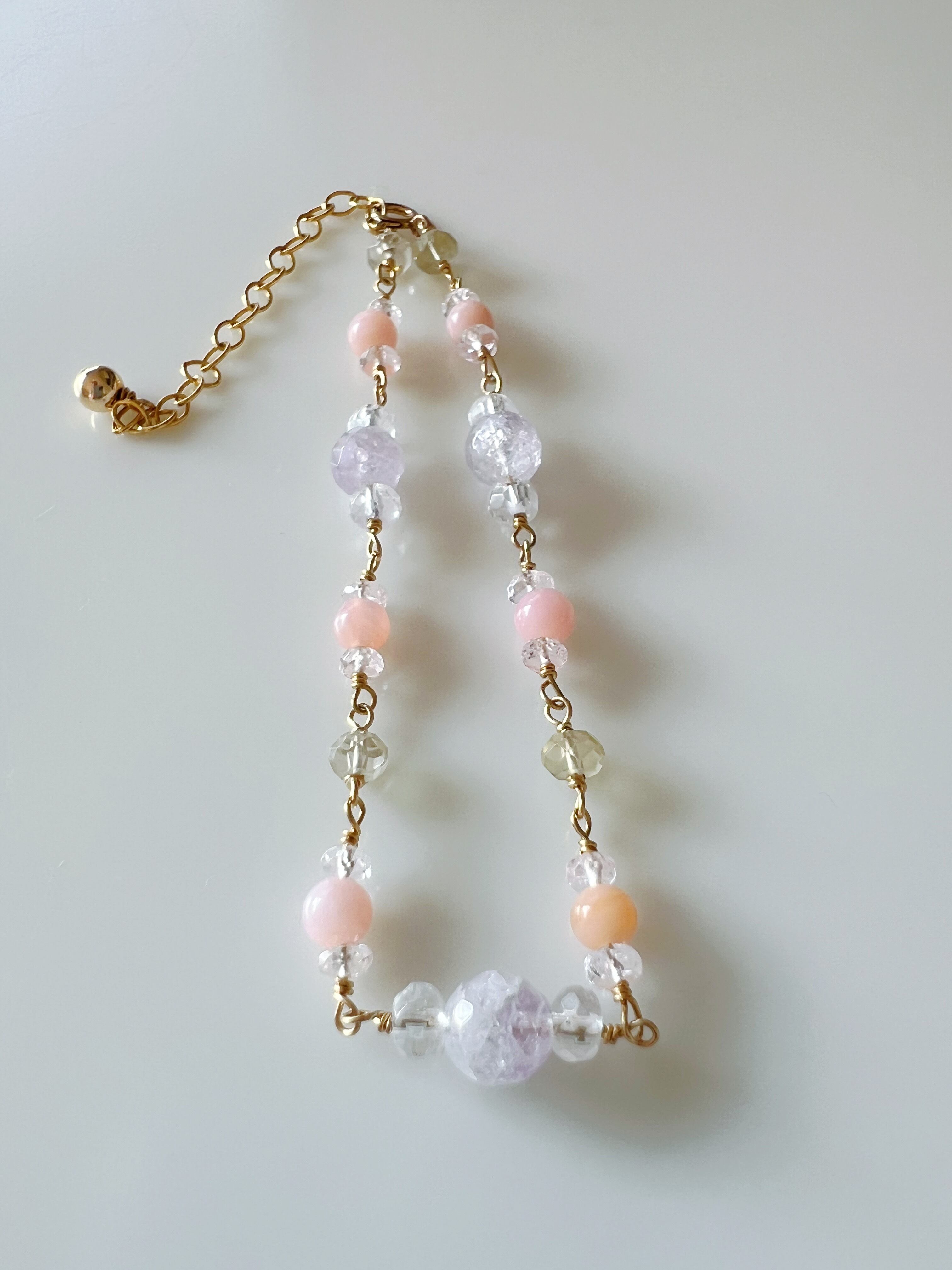 柔らかなピンクと紫のパステルな色合いが魅力的なモルガナイトとピンクオパールのブレスレット。穏やかな色調が肌に優しく馴染みます。